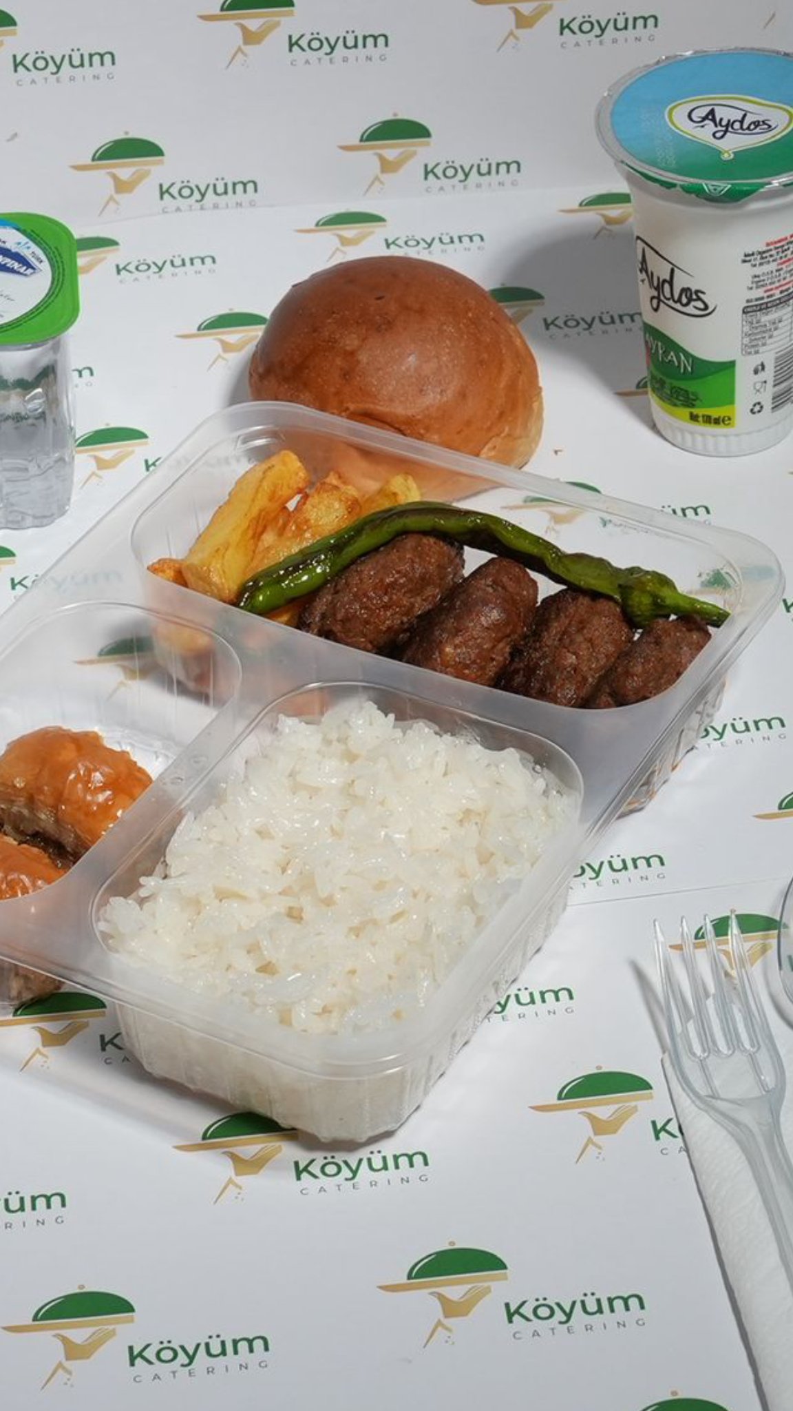 Köyüm Catering’in özenle hazırladığı ızgara köfte menüsü; yanında tereyağlı pilav, kızarmış patates ve biber ile sunulur. Roll ekmek, ayran, su ve seçeceğiniz tatlı ile doyurucu bir öğün deneyimi yaşatır.