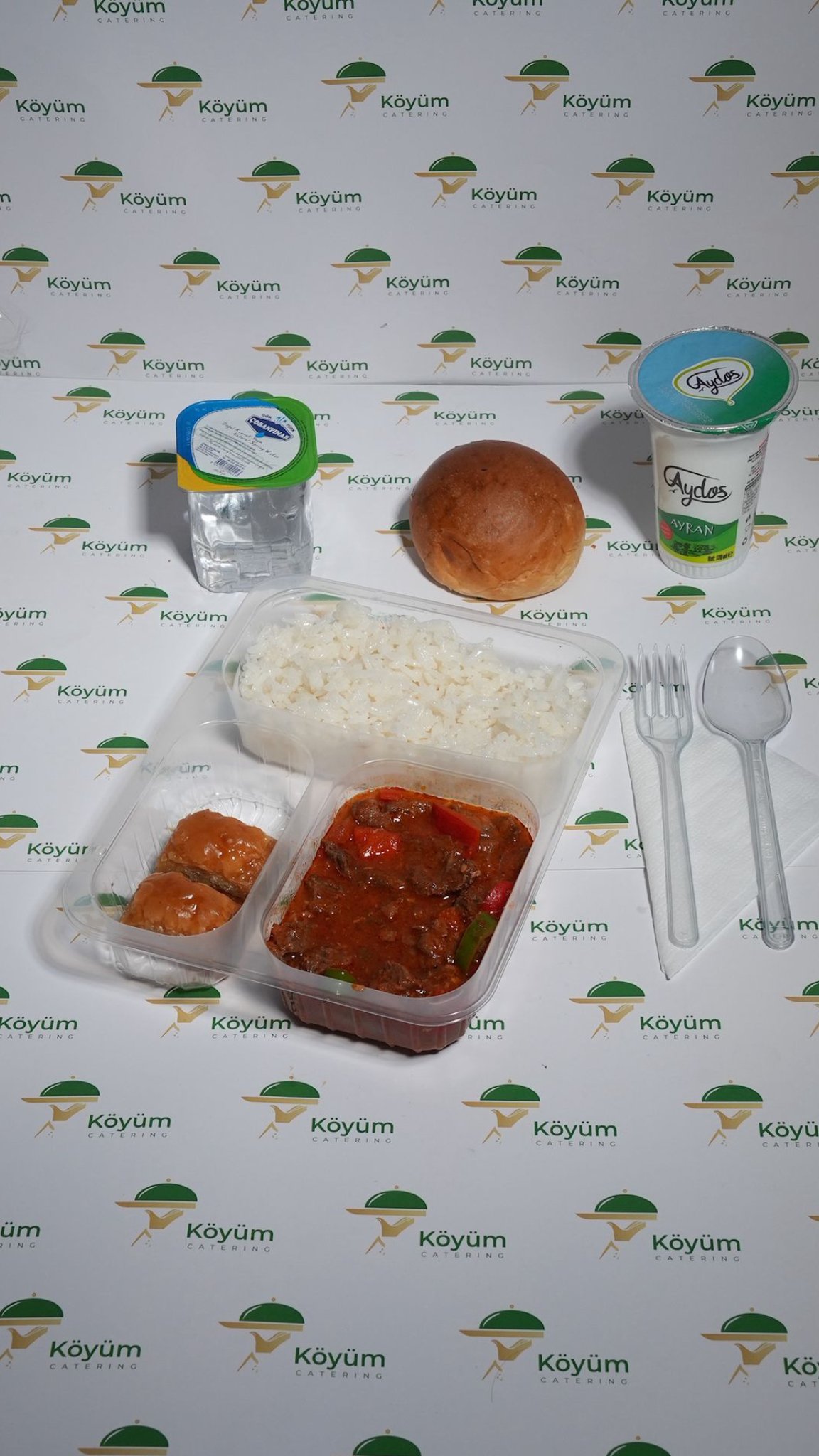 Et severler için ideal seçenek: yumuşacık tas kebap, tereyağlı pilav ile servis edilir. Ayran, su, roll ekmek ve seçmeli tatlı ile geleneksel, doyurucu bir öğün sunar. Köyüm Catering’in kaliteli malzemeleriyle hazırlanır.