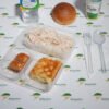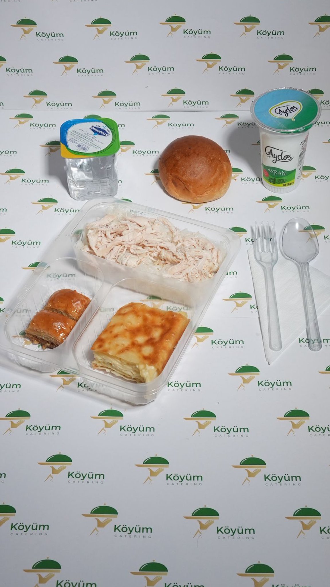 Hafif ve dengeli bir tercih: haşlanmış tavuk eti tereyağlı pilav üzerinde. Su böreği, ayran, su, roll ekmek ve seçmeli tatlı ile tamamlanır. Köyüm Catering tarafından günlük ve taze hazırlanır.