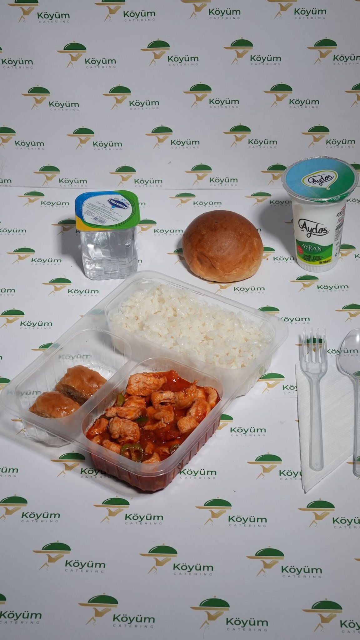Özenle pişirilen tavuk sote, tereyağlı pilav ile sunulur. Ayran, su, roll ekmek ve seçeceğiniz tatlı ile dengeli, besleyici ve doyurucu bir menü oluşturur. Köyüm Catering güvencesiyle.